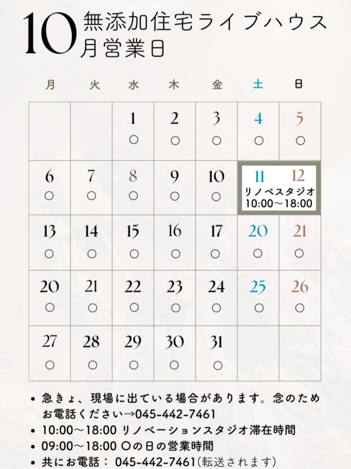 無添加住宅リノベーションスタジオは、10/11(土)、12(日)の2日間10:00~18:00、だけの限定オープン。