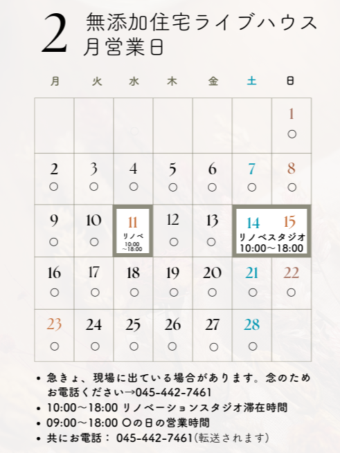 無添加住宅リノベーションスタジオは、2/11(水・祝)、13(土)、14(日)の3日間。