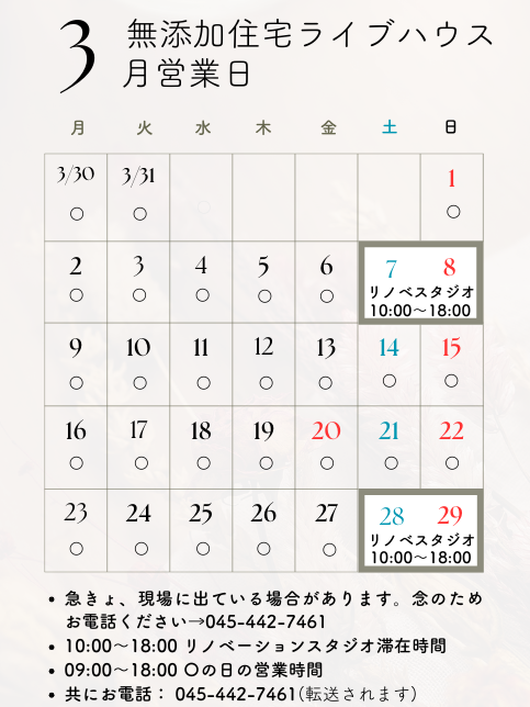 3月の営業日とリノベーションスタジオ滞在日のお知らせ
