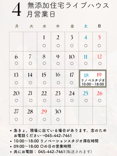 4月の営業日とリノベーションスタジオ営業日のお知らせ