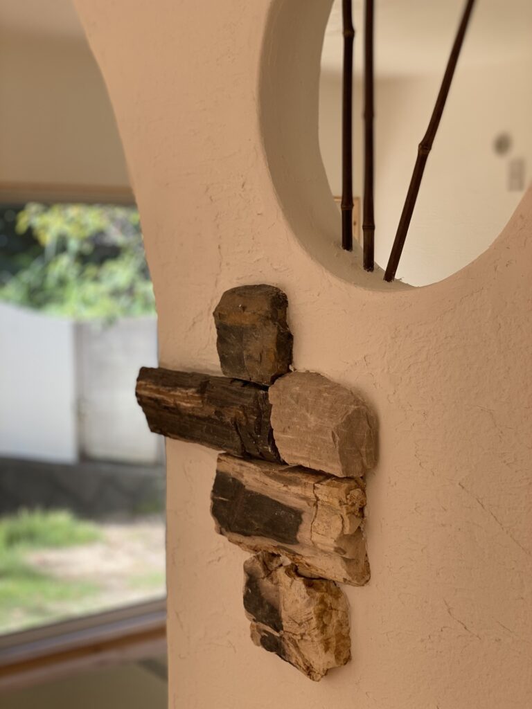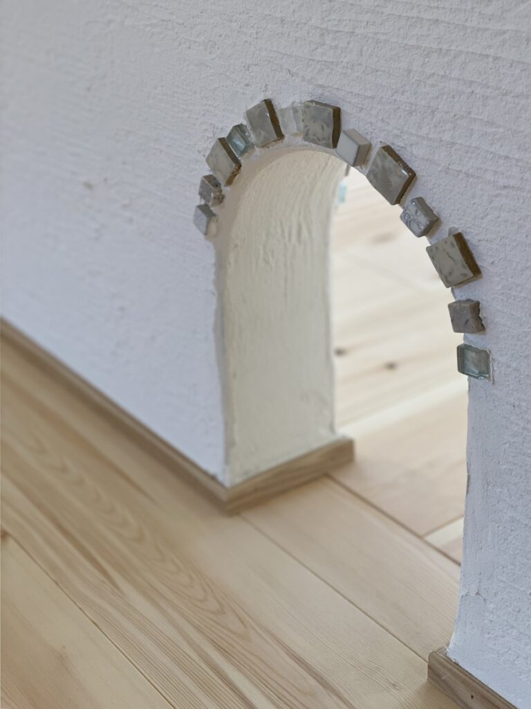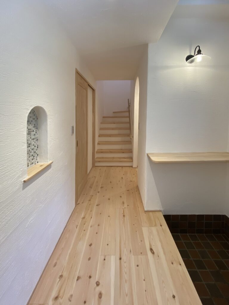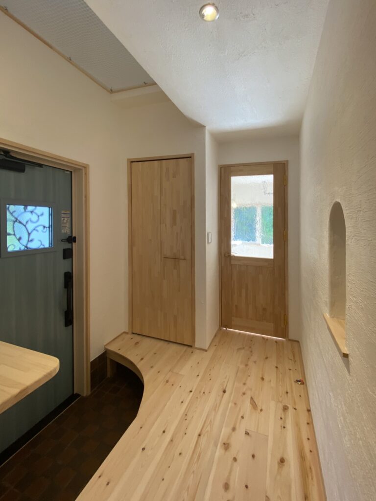 • After玄関 リフォーム ビニールクロスから漆喰塗りへ アーチ部分コーラルストーン貼り 無添加住宅ライブハウス
