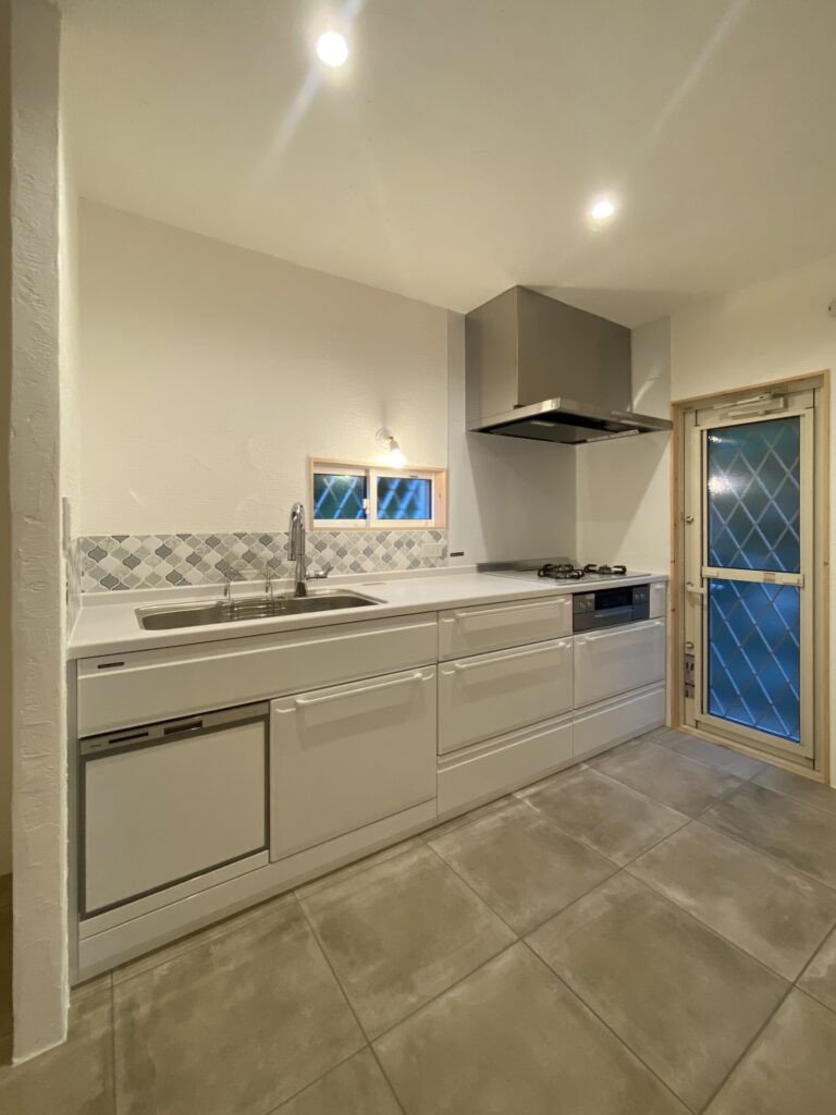After キッチン 勝手口ドアを取替え。漆喰塗りと床タイル