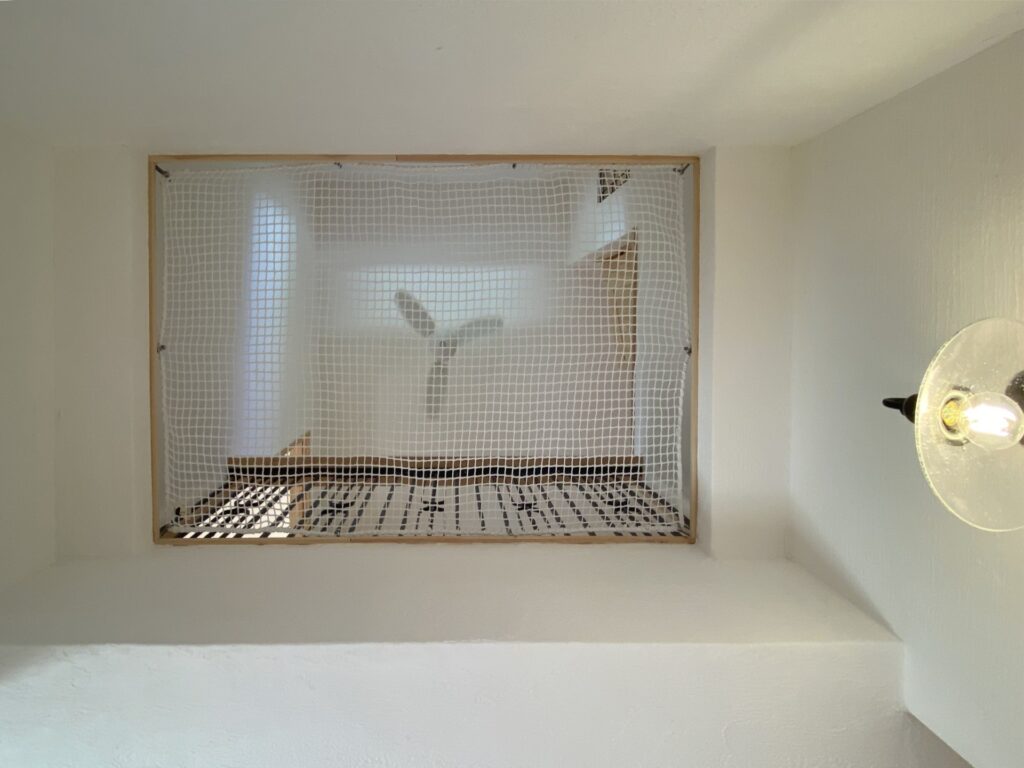 玄関吹抜けにはネコちゃん落下防止ネットを設置。勢いあまって足を滑らせても安心♪