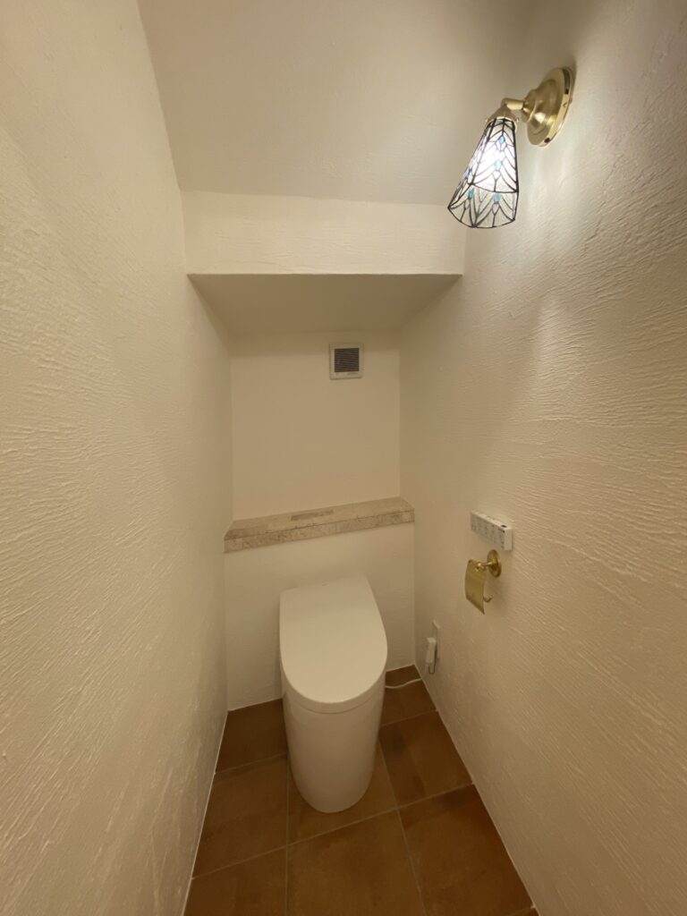 After トイレ 窓を無くし、床をタイルに、背面の天板は天然石を乗せました