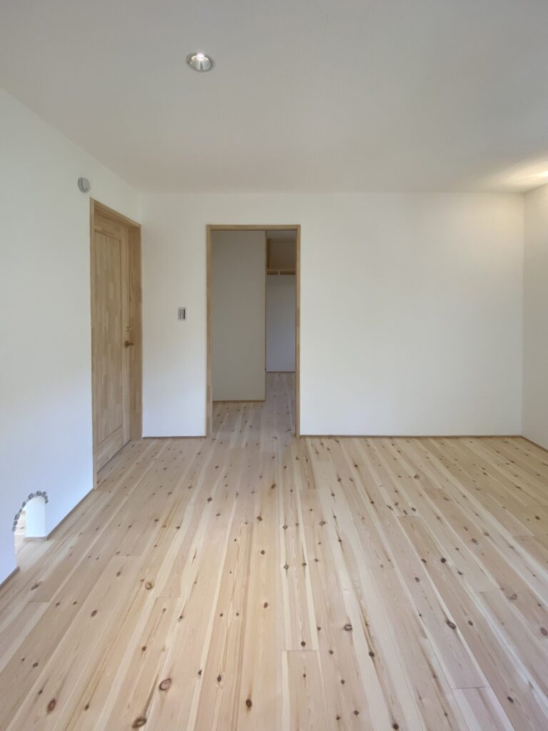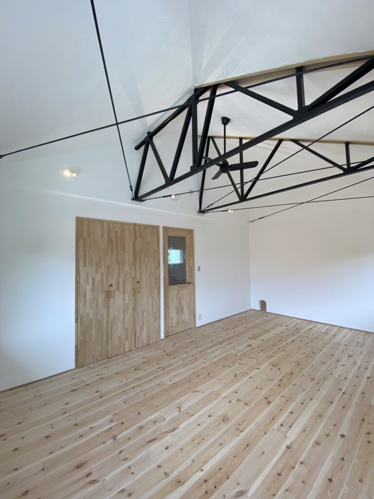 After 築42年 軽量鉄骨リフォーム 個室とウォークインクローゼット 軽量鉄骨フレームを見せた勾配天井 ビニールクロスから漆喰塗りへ 合板フローリングから無垢フローリングへ 無垢ドア 無添加住宅ライブハウス