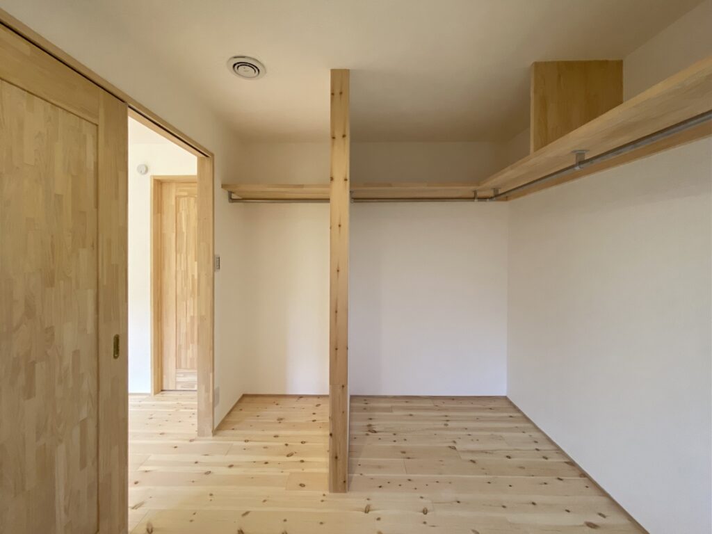 ウォークインクロゼットの入り口は、ドアを開けていても個室側から丸見えにならないように袖壁を設置
