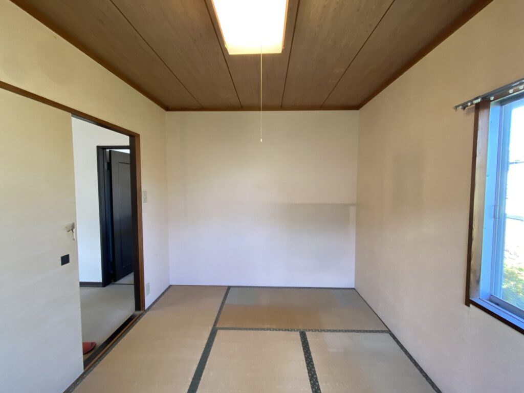 Before 畳コーナー 左手に袖壁を付け天井下の小さな垂れ壁を残しているので、障子がなくても落ち着いた雰囲気に。左壁の廊下への出入口は塞ぎました